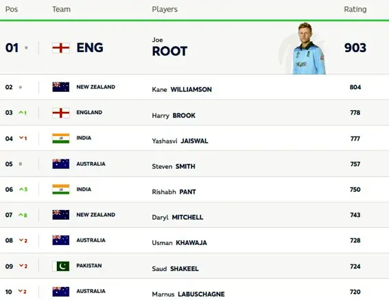 शीर्ष टेस्ट बल्लेबाजों की सूची में शामिल अन्य भारतीय बल्लेबाजों में बाएं हाथ के युवा सलामी बल्लेबाज यशस्वी जायसवाल भी मौजूद हैं जो एक पायदान नीचे चौथे स्थान पर खिसक गए हैं.