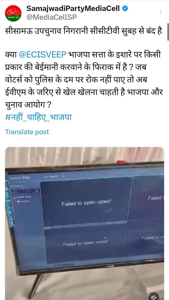 इसके बाद समाजवादी पार्टी के मीडिया सेल ने बंद CCTV कैमरों का फुटेज X पर शेयर किया गया. जिसमें लिखा- सीसामऊ उपचुनाव निगरानी में लगे CCTV सुबह से बंद हैं क्या? भाजपा सत्ता के इशारे पर किसी तरह की बेईमानी करवाने की फिराक में है. जब वोटर्स को पुलिस के दम पर रोक नहीं पाए तो अब EVM के जरिए खेल खेलना चाहती है.