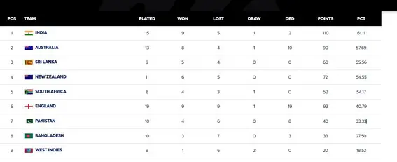 उधर WTC टेबल में ऑस्ट्रेलिया दूसरे स्थान पर स्लिप कर गई है. कंगारू टीम के 13 मैच में 8 जीत, चार हार एवं एक ड्रॉ से 90 अंक हैं. उसका अंक प्रतिशत 57.69 है. उधर श्रीलंका की टीम तीसरे स्थान पर है. श्रीलंका के नौ मैचों में 55.56 प्रतिशत अंक और 60 पॉइंट हैं. वहीं न्यूजीलैंड चौथे, साउथ अफ्रीका पांचवें और इंग्लैंड छठे पायदान पर है. जबकि पाकिस्तान सातवें, बांग्लादेश आठवें और वेस्टइंडीज नौवें नंबर पर है.