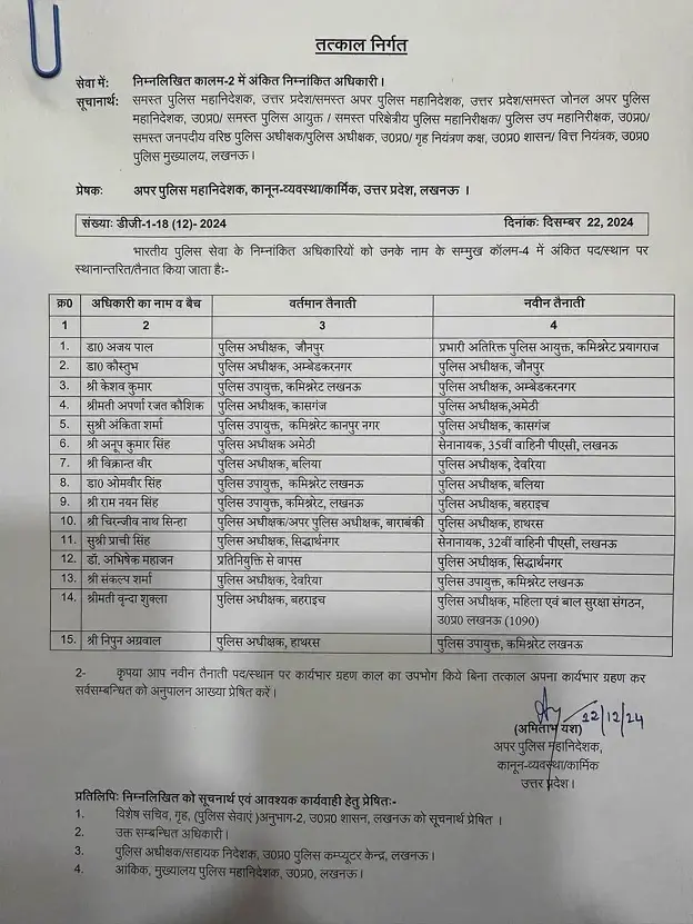 एडीजी कानून-व्यवस्था एवं कार्मिक अमिताभ यश द्वारा जारी आदेश के मुताबिक जौनपुर के एसपी अजय पाल शर्मा को प्रयागराज कमिश्नरेट में प्रभारी अतिरिक्त पुलिस आयुक्त बनाया गया है. अंबेडकरनगर के एसपी डॉ. कौस्तुभ को जौनपुर का एसपी बनाया गया है. लखनऊ में पुलिस उपायुक्त केशव कुमार को अंबेडकरनगर का एसपी बनाया गया है. देवरिया के एसपी संकल्प शर्मा और हाथरस के एसपी निपुन अग्रवाल को लखनऊ पुलिस कमिश्नरेट में पुलिस उपायुक्त बनाया गया है. कासगंज की एसपी अपर्णा रजत कौशिक को अमेठी का एसपी बनाया गया है.