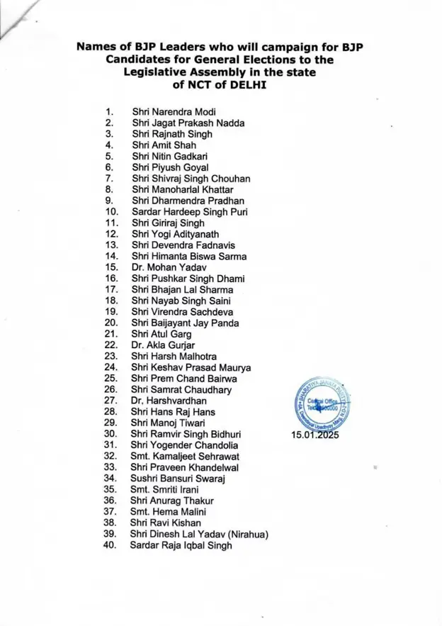 दिल्ली विधानसभा चुनाव के लिए भाजपा के स्टार प्रचारकों की सूची में उत्तर प्रदेश के कई दिग्गजों के नाम शामिल हैं. इसमें सबसे ऊपर मुख्यमंत्री योगी आदित्यनाथ का नाम है. इस सूची में उत्तर प्रदेश के उप मुख्यमंत्री केशव प्रसाद मौर्य का नाम है. साथ ही गाजियाबाद से भाजपा सांसद अतुल गर्ग भी हैं. इसमें गोरखपुर से भाजपा सांसद रवि किशन शुक्ला का भी नाम है.