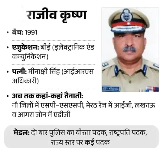राजीव कृष्ण की गिनती तेज-तर्रार अफसरों में होती है. सीएम योगी के भी काफी करीबी माने जाते हैं. सीएम ने इन्हें यूपी की सबसे कठिन परीक्षाओं में से एक पुलिस भर्ती परीक्षा कराने की जिम्मेदारी इन्हें सौंपी थी. उस पर ये खरे उतरे थे. राजीव कृष्ण 1991 बैच के आईपीएस अधिकारी हैं. मूलरूप से नोएडा के रहने वाले राजीव कृष्ण का जन्म 26 जून, 1969 को हुआ था. इस समय विजिलेंस के डायरेक्टर और पुलिस भर्ती बोर्ड के चेयरमैन के तौर पर काम कर रहे हैं. राजीव कृष्ण ऐसे घराने से संबंध रखते हैं, जहां एक दो नहीं 6 से ज्यादा अफसर हैं. उनकी पत्नी IRS अफसर हैं और मौजूदा समय में नोएडा में CBDT में डिप्टी सेक्रेटरी हैं.