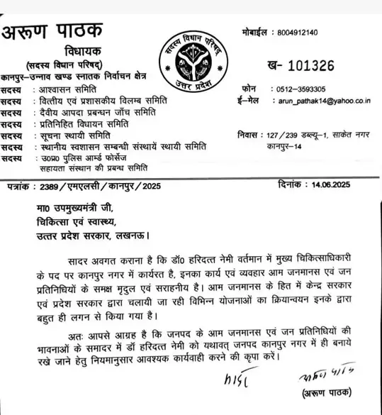 विधायक ने सीएमओ के पक्ष में लेटर लिखकर डिप्टी सीएम व चिकित्सा स्वास्थ्य मंत्री बृजेश पाठक को कानपुर में ही रखने के लिए कहा है.