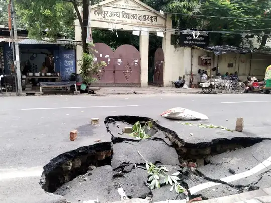कानपुर में रविवार शाम से सोमवार तक मूसलाधार बारिश के बाद शहर की तीन जगहों पर सड़कें धंस गईं. बारिश के कारण शहर के कई इलाकों में जल भराव की स्थिति बन गई.