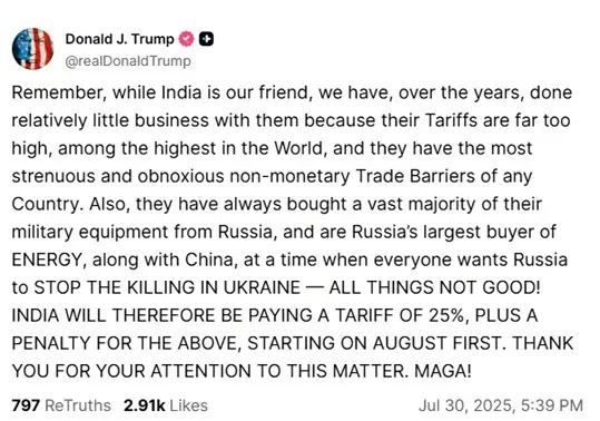 ट्रंप की मानें तो भारत लगातार सैन्य उपकरण रूस से खरीदते आया है, जो कि सही नहीं है. हर कोई चाहता है कि रूस यूक्रेन पर हमला रोके, लेकिन भारत रूस से लगातार व्यापार को बढ़ा रहा है, जो कि सही कदम नहीं है. इसलिए इन सभी मामलों को देखते हुए अमेरिका ने भारत पर 25 फीसदी टैरिफ लगाने का फैसला किया है, और ये 1 अगस्त से लागू हो जाएगा.