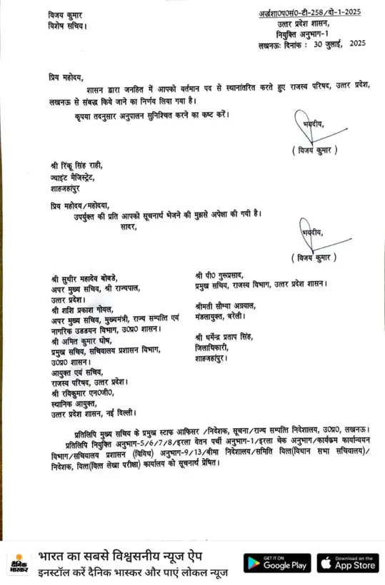 ये IAS रिंकू राही के ट्रांसफर की आदेश कॉपी है, जिसे शासन ने जारी किया है.