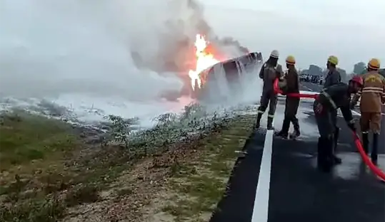 मथुरा में केमिकल से भरा टैंकर जयपुर-बरेली हाईवे पर पलट गया. इसके बाद धमाके के साथ टैंक फट गया और भीषण आग लग गई. पलभर में आग ने विकराल रूप ले लिया. टैंकर चालक ने कूदकर जान बचाई. आग की लपटें 20 फीट ऊंची उठने लगीं और धुएं का गुबार 1 किमी दूर से दिखाई देने लगा.
