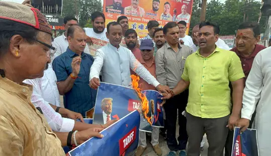 कानपुर में भारतीय उद्योग व्यापार प्रतिनिधिमंडल के प्रदेश अध्यक्ष ज्ञानेश मिश्र के नेतृत्व में ट्रंप का पोस्टर दहन हुआ। उनके साथ केके गुप्ता, रमेश केसरवानी, नीरज शुक्ला, विनायक पोद्दार, पवन गौड़, जय शर्मा समेत कई कारोबारी विरोध प्रदर्शन में शामिल रहे। ज्ञानेश मिश्र ने कहा कि ट्रंप ने 50 प्रतिशत टैरिफ लगाकर भारत के साथ विश्वासघात किया है।