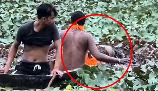 शव तालाब में जलकुंभियों के बीच फंसा हुआ था. स्थानीय गोताखोरों ने नाव और रस्सी के सहारे शव को बाहर निकालने की कोशिश की.