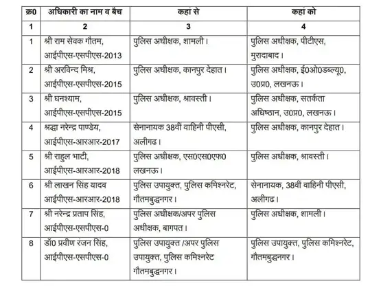 2017 बैच की श्रद्धा नरेंद्र पांडे को कानपुर देहात का SP बनाया गया है. 2018 बैच के राहुल भाटी को SP श्रावस्ती और हाल ही में अपर पुलिस अधीक्षक से आईपीएस बने नरेंद्र प्रताप सिंह को शामली का कप्तान नियुक्त किया गया है. नोएडा में डीसीपी के रूप में तैनात लाखन सिंह यादव को 38वीं पीएसी अलीगढ़ में भेजा गया है. वहीं हाल ही में प्रमोशन पाकर आईपीएस बने प्रवीण रंजन सिंह को गौतमबुद्धनगर का डीसीपी नियुक्त किया गया है.