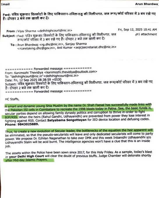 दिल्ली हाई कोर्ट को भी मिला था बम की धमकी वाला मेल: इससे पहले, दिन में दिल्ली हाई कोर्ट में बम की धमकी मिलने से वादियों और न्यायाधीशों में दहशत फैल गई थी जिससे न्यायाधीशों को अचानक उठना पड़ा था. यह अफरा-तफरी एक ईमेल के बाद मची थी जिसके जरिए न्यायालय प्रशासन को उच्च न्यायालय पर हमले की धमकी मिली थी. इसके बाद पुलिस और अन्य एजेंसियों ने तलाशी अभियान शुरू किया था.