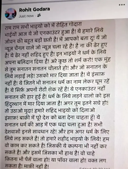रोहित गोदारा की धमकी- ये इंसाफ नहीं है: गुरुवार सुबह 10.22 बजे रोहित गोदारा नाम की फेसबुक से पोस्ट हुआ है. इसमें लिखा है- इन भाइयों ने धर्म के लिए अपना बलिदान दिया है. अरे कुछ तो शर्म करो. एक मुंह से तुम सनातन-सनातन चिल्लाते हो जो सनातन के लिए लड़ाई लड़े, उसको मार दिया जाता है. ये इंसाफ नहीं है. ये जितने भी सनातन धर्म का नाम लेकर घूम रहें हैं, ये सिर्फ अपनी रोटी सेंक रहे हैं. ये एनकाउंटर नहीं, सनातन की हार हुई है. धर्म के लिए लड़ने वालो को इस हिंदुस्तान में मार दिया जाता है. अगर तुम इतने सच्चे हो तो उठाओ मुद्दा. हमारे शहीद भाइयों को इंसाफ दिलाओ.