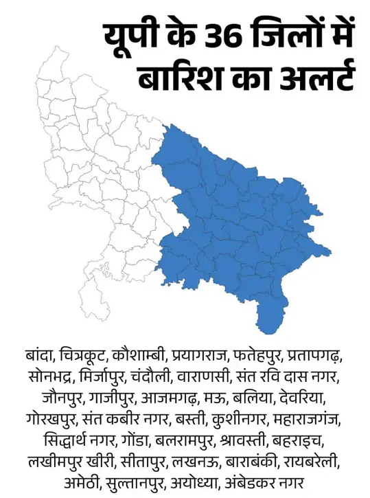 यूपी के कई जिलों में बीते दो दिनों से जमकर बारिश हो रही है. यह सिलसिला आगे भी जारी रहेगा. फतेहपुर में सुबह से बारिश हो रही है. लखनऊ में भी बादल छाए हैं। ठंडी हवा चल रही है. दशहरे पर आज 36 जिलों में अलर्ट है.