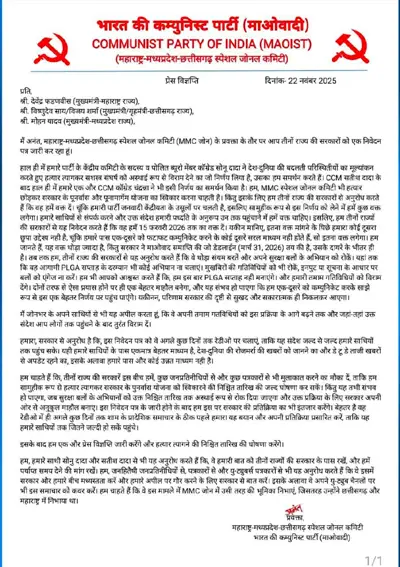 MMC जोन के सभी नक्सली एक साथ सरेंडर करेंगे. हालांकि, इस लेटर में, MMC जोन के नक्सलियों ने एक-दूसरे से बातचीत करने के लिए 15 फरवरी 2026 की डेडलाइन मांगी है.
