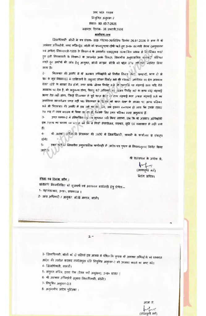 बरेली के सिटी मजिस्ट्रेट अलंकार अग्निहोत्री ने सोमवार देर रात अपना सरकारी आवास खाली कर दिया. इससे पहले वे जिलाधिकारी अविनाश सिंह आवास पर मिलने पहुंचे. वहां पर वरिष्ठ प्रशासन और पुलिस अधिकारी बातचीत में शामिल रहे. वापस आने पर उन्होंने आरोप लगाया है कि जिला अधिकारी आवास पर उन्हें 45 मिनट तक बंधक बनाया. किसी तरह छूट कर बाहर आए. देर रात लगभग 12:15 बजे उन्होंने सरकारी आवास को छोड़ दिया, घर का सामान एक ट्रक में भरकर वहां से रवाना हो गए. सूत्रों के मुताबिक वो अभी बरेली में ही है लेकिन वो कहाँ गए इसको गोपनीय रखा गया. जाते वक्त उनके समर्थन में लोग नारे बाजी करते नजर आए.