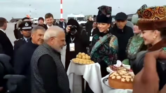 इससे पहले कजान अतंरराष्ट्रीय हवाईअड्डे पर उतरने के बाद पीएम मोदी के स्वागत में उन्हें सैनिक सलामी दी गयी और रूस के अधिकारियों ने उनका औपचारिक रूप से स्वागत किया। अतिथि के रूप में पीएम मोदी का परंपरागत रूप से स्वागत के लिये पारंपरिक वेशभूषा में महिलाएं केक और मिष्ठान लेकर उपस्थित थीं. इस मौके पर वहां प्रधानमंत्री की आगवानी के लिये मॉस्को में भारत के राजदूत विनय कुमार भी मौजूद थे.